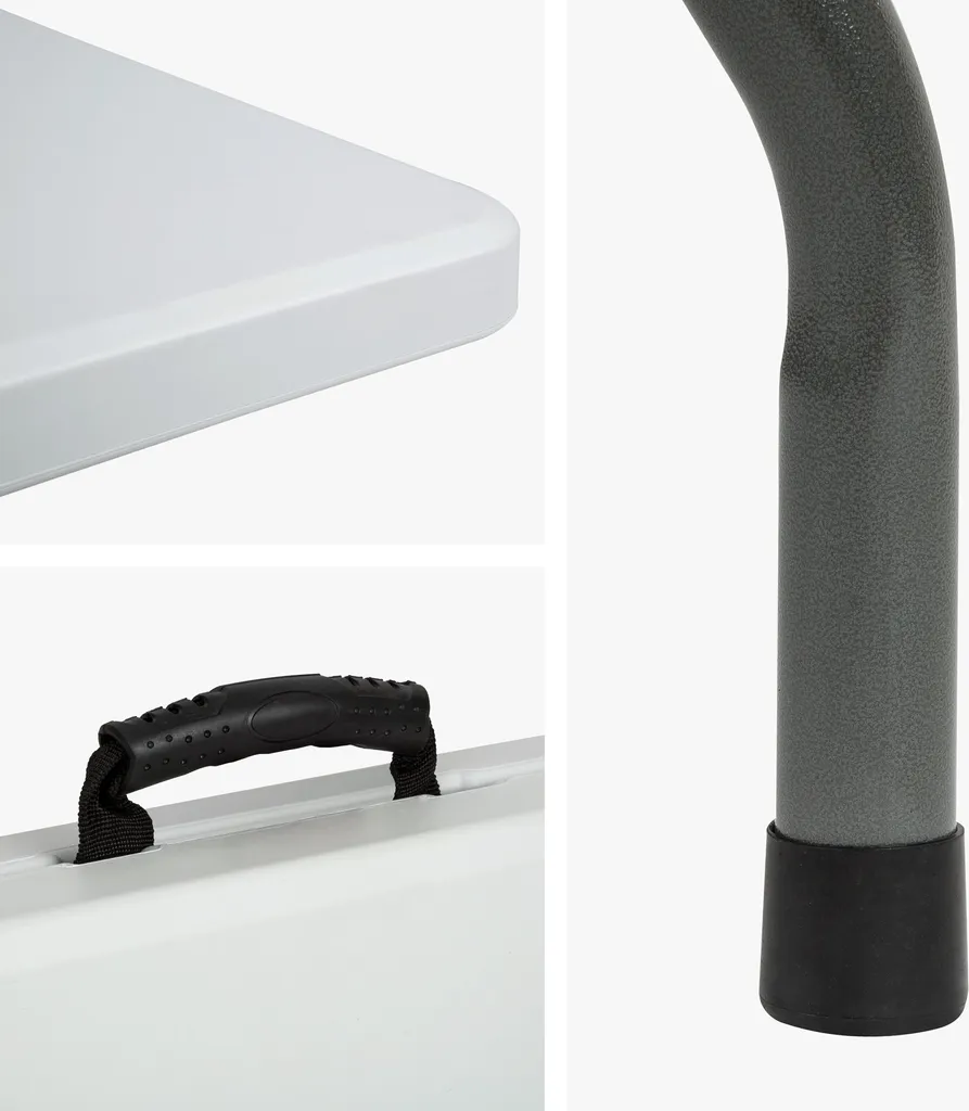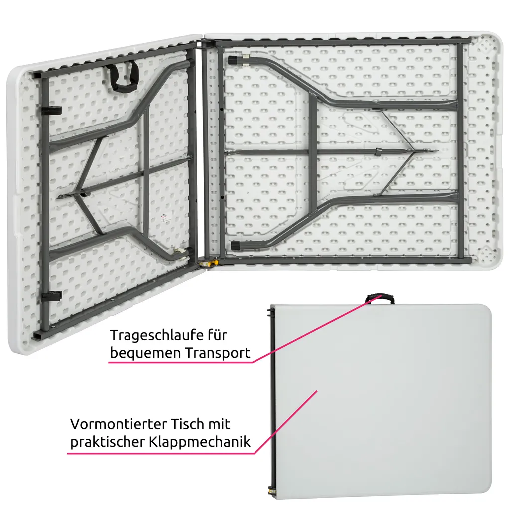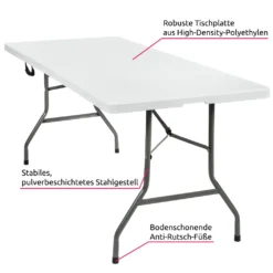 Mit diesem Klapptisch bist Du bestens ausgerüstet. Genieße entspannte Stunden zuhause im Garten oder unterwegs beim Camping! Die Tischplatte aus Kunststoff ist resistent gegen Feuchtigkeit und andere Umwelteinflüsse. Klapptische lassen sich mit wenigen Handgriffen zusammenklappen und platzsparend verstauen. Das Untergestell aus Stahl ist sehr robust und langlebig. Der Tisch ist groß genug, dass die ganze Familie daran Platz findet. Kurzum: Unser Klapptisch ist der perfekte Begleiter für zuhause oder Deinen nächsten Ausflug!