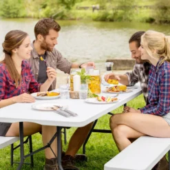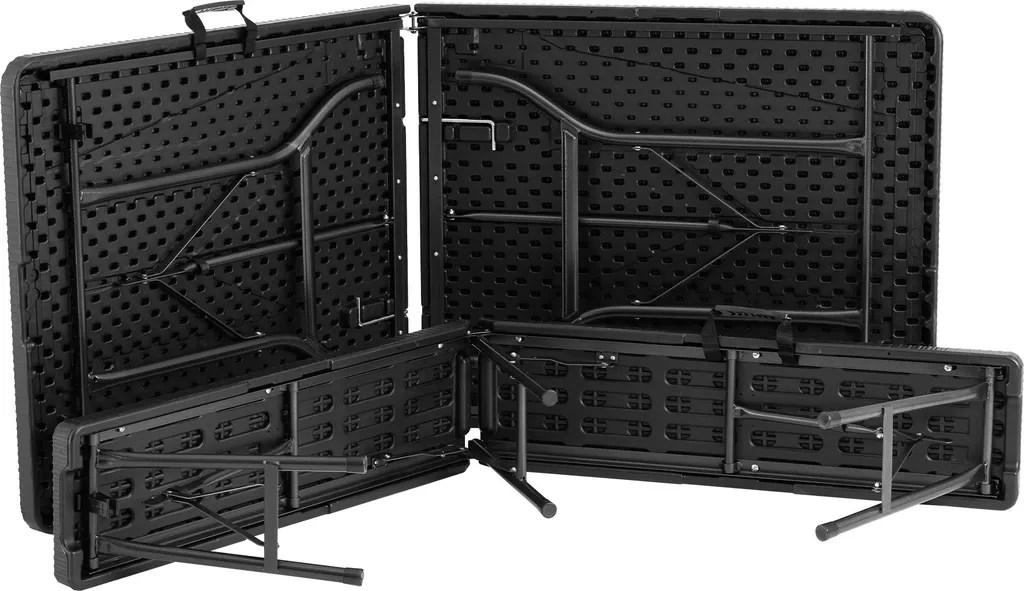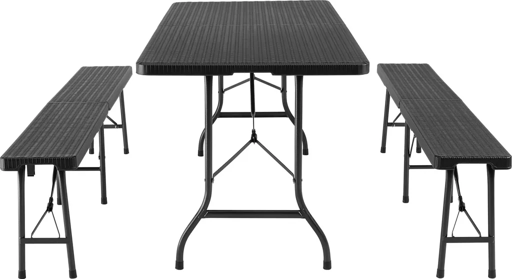 Diese große Campingtischgarnitur von tectake bringt im Handumdrehen ein Stück wohnlichen Komfort ins Grüne – einfach aufklappen und gemütlich hinsetzen. Die Oberflächen sind aus unempfindlichem Kunststoff gefertigt und besitzen zum Schutz abgerundete Ecken. Das robuste Gestell aus lackiertem Stahl verleiht dem pflegeleichten Set enorme Stabilität, hohe Belastbarkeit und große Standsicherheit. Gepackt lässt sich die dreiteilige Bierzeltgarnitur bequem an den seitlichen Griffen tragen und dank der geringen Maße auch ohne viel Platzbedarf verstauen.