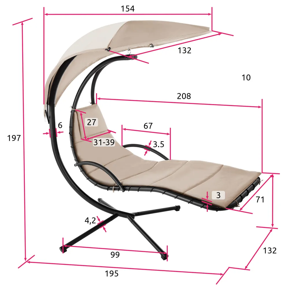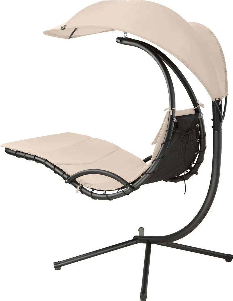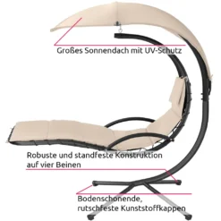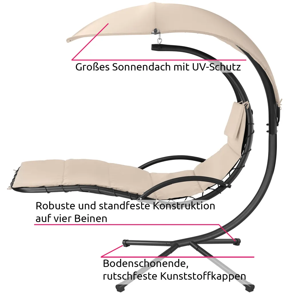 Vom Alltag abschalten und einfach genießen wird auf dieser attraktiven Hängeliege von tectake zu einer Leichtigkeit. Die ergonomisch geformte Liegefläche mit der weichen Polsterauflage macht Relaxen zum puren Genuss. Das große Sonnendach spendet kühlenden Schatten und kann bei Bedarf auch entfernt werden. Die pulverbeschichtete Stahlkonstruktion besitzt eine stabile Aufhängung und ruht kippsicher auf vier rutschfesten Beinen – einfach perfekt für den stilvollen Ausklang eines schönen Tages.