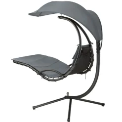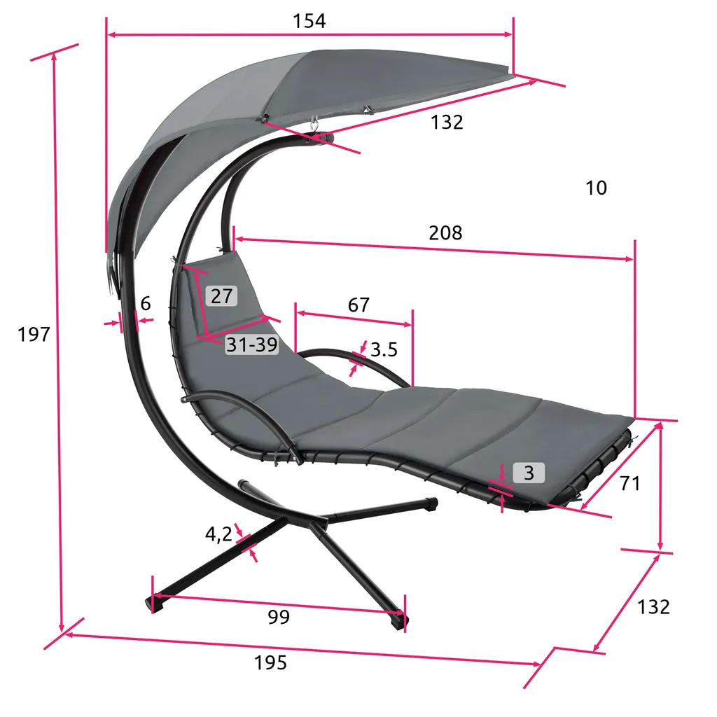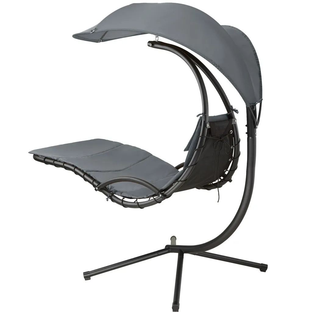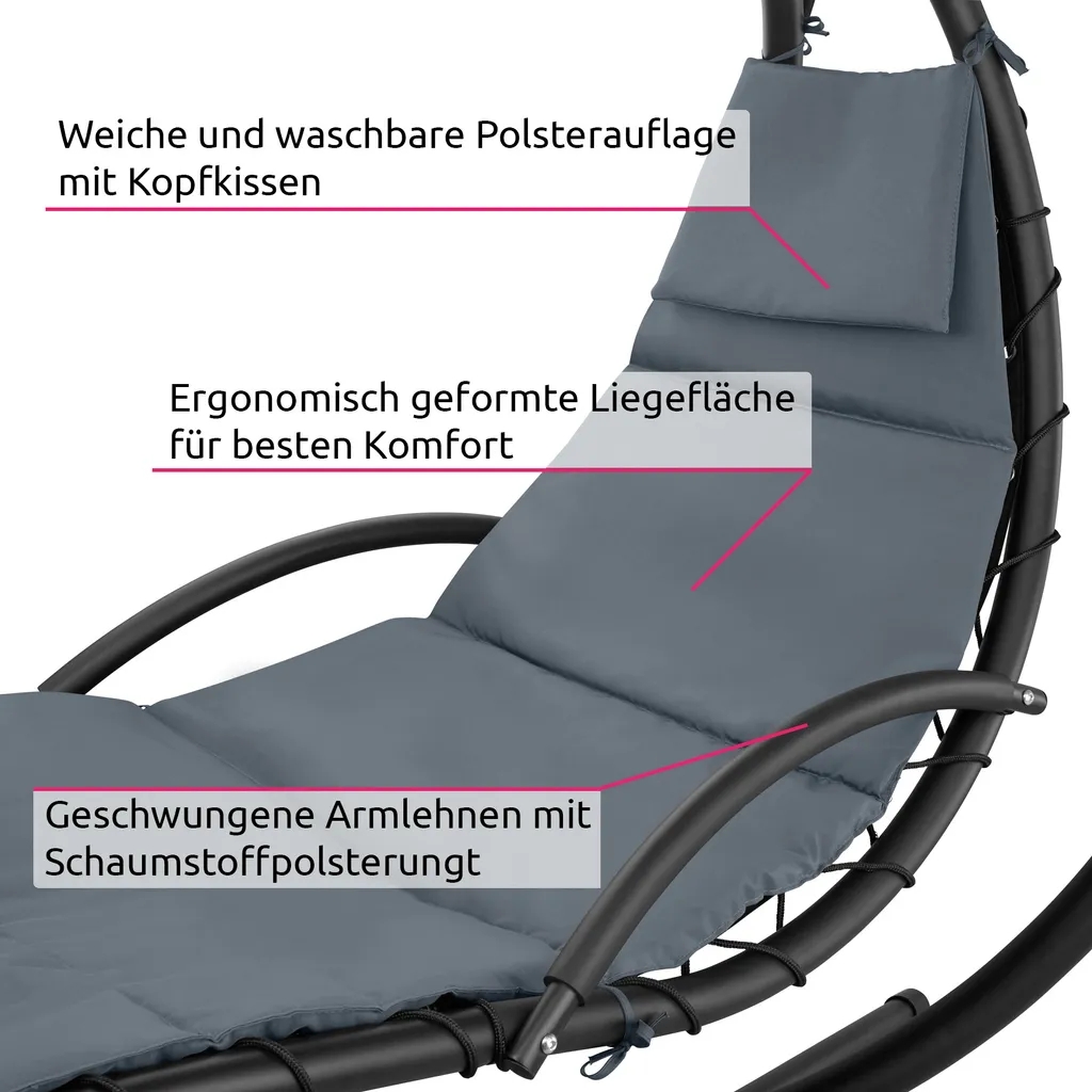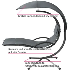Vom Alltag abschalten und einfach genießen wird auf dieser attraktiven Hängeliege von tectake zu einer Leichtigkeit. Die ergonomisch geformte Liegefläche mit der weichen Polsterauflage macht Relaxen zum puren Genuss. Das große Sonnendach spendet kühlenden Schatten und kann bei Bedarf auch entfernt werden. Die pulverbeschichtete Stahlkonstruktion besitzt eine stabile Aufhängung und ruht kippsicher auf vier rutschfesten Beinen – einfach perfekt für den stilvollen Ausklang eines schönen Tages.