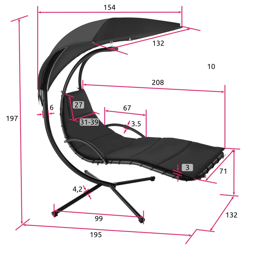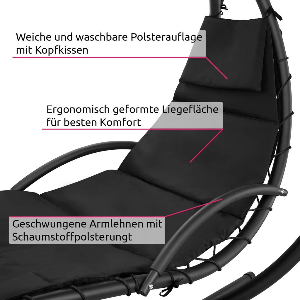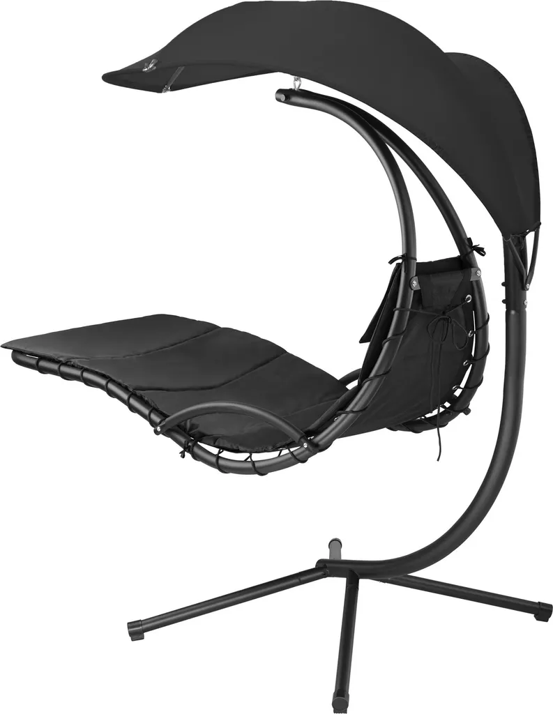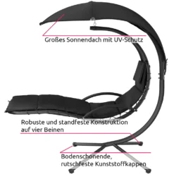 Vom Alltag abschalten und einfach genießen wird auf dieser attraktiven Hängeliege von tectake zu einer Leichtigkeit. Die ergonomisch geformte Liegefläche mit der weichen Polsterauflage macht Relaxen zum puren Genuss. Das große Sonnendach spendet kühlenden Schatten und kann bei Bedarf auch entfernt werden. Die pulverbeschichtete Stahlkonstruktion besitzt eine stabile Aufhängung und ruht kippsicher auf vier rutschfesten Beinen – einfach perfekt für den stilvollen Ausklang eines schönen Tages.