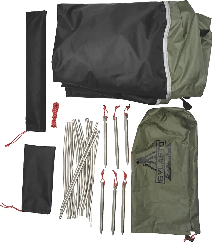 Ausgestattet mit einer Tragetasche, einem Windseil und 6 Zeltheringen.
