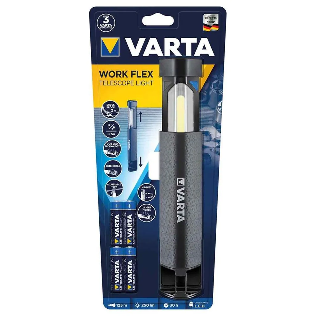 Varta Work Flex. Lampentechnologie: LED, Lichtleistung: 250 lm, LED Typ: COB LED. Produktfarbe: Schwarz, Internationale Schutzart (IP-Code): IPX4. Akku-/Batterietyp: AA