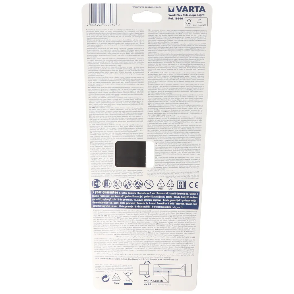 Varta Cons.Varta Work Flex Telescope Light 18646 Hersteller: Varta Cons.Varta Bezeichnung: Work Flex Telescope Light 4AA mit Batterien Typ: 18646 Ausführung: Stableuchte Batterieart: Mignon ANSI: AA Anzahl der Batterien: 4 Mit Batterien mitgeliefert: ja Aufladbar: nein Leuchtmittel: LED nicht austauschbar Mit Leuchtmittel: ja Gehäusefarbe: anthrazit Werkstoff: Kunststoff Länge: 208 mm Schutzart (IP): sonstigeVarta Cons.Varta Work Flex Telescope Light 18646: weitere DetailsAusziehbare Arbeitsleuchte mit 2 Leuchtmodi (Spotlicht und Flächenlicht) und einem gummierten Anti-Rutsch-Griff. Das Flächenlicht erscheint wenn die Taschenlampe ausgezogen ist. Verschiedene Befestigungsmöglichkeiten durch einen integrierten Haken und Magnet für ein freihändiges Arbeiten. Teleskop-Flächenlicht und COB LED-Technologie beim Flächenlicht. Hochleistungs-LED, ausziehbarer Haken, Magnet, gummierter Anti-Rutsch-Griff, stoßfest 2m, IPX4 spritzwassergeschützt und schmutzresistente Oberfläche. Geliefert wird: Varta Cons.Varta Work Flex Telescope Light 4AA mit Batterien 18646, Verpackungseinheit: 3 Stück, EAN: 4008496977987