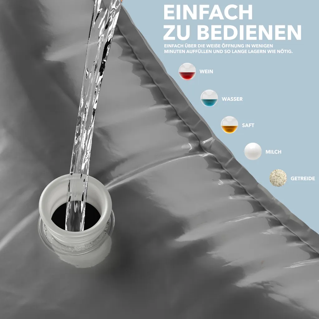 VERTRAUENSWÜRDIGES MATERIAL: Das Außenmaterial besteht aus einer reißfesten Lichtschutzfolie und die Innenseite aus der lebensmittelechten Kunststofffolie. Die Materialien dieser Wassergallone 20L sind steril und BPA-frei. Das Außenmaterial schützt die darin enthaltene Flüssigkeit oder Körner und hält sie monatelang frisch.