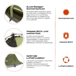 Hochwertig verarbeitetes Wanderzelt mit effektivem Sonnenschutz, Regenschutz, Windschutz sowie Schutz vor Sandflug. Das Leichtzelt kommt in Grün oder Grau und ist überdies in mehreren Varianten und Größen separat erhältlich: Für 1 Person, mit 3 oder 4 Stangen.