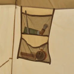Das Zelt verfügt über eine Halterung für Handtücher und Kleidung und ein Fenster, welches durch einen Vorhang verschließbar ist. Für Ordnung sorgen zwei Taschen, in denen bequem alle nötigen Dinge verstaut werden können.