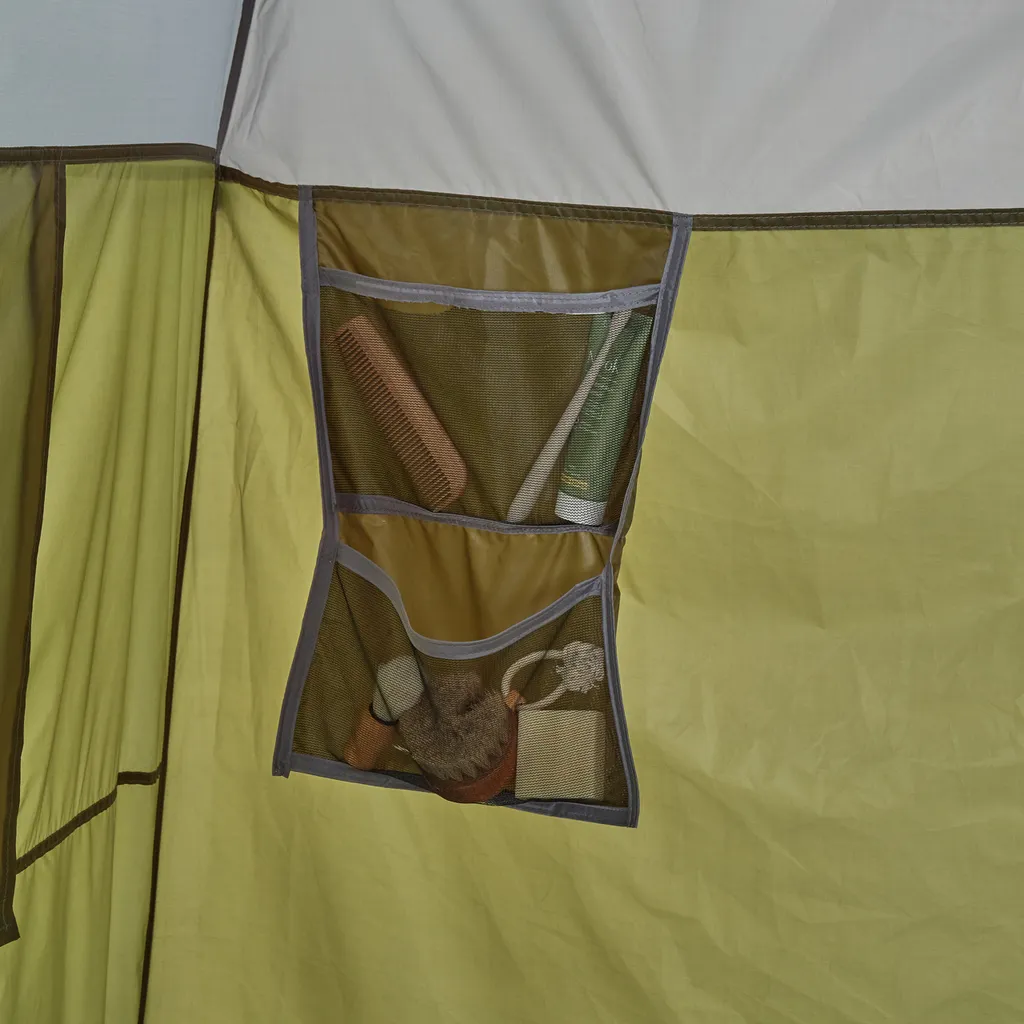 Das Zelt verfügt über eine Halterung für Handtücher und Kleidung und ein Fenster, welches durch einen Vorhang verschließbar ist. Für Ordnung sorgen zwei Taschen, in denen bequem alle nötigen Dinge verstaut werden können.