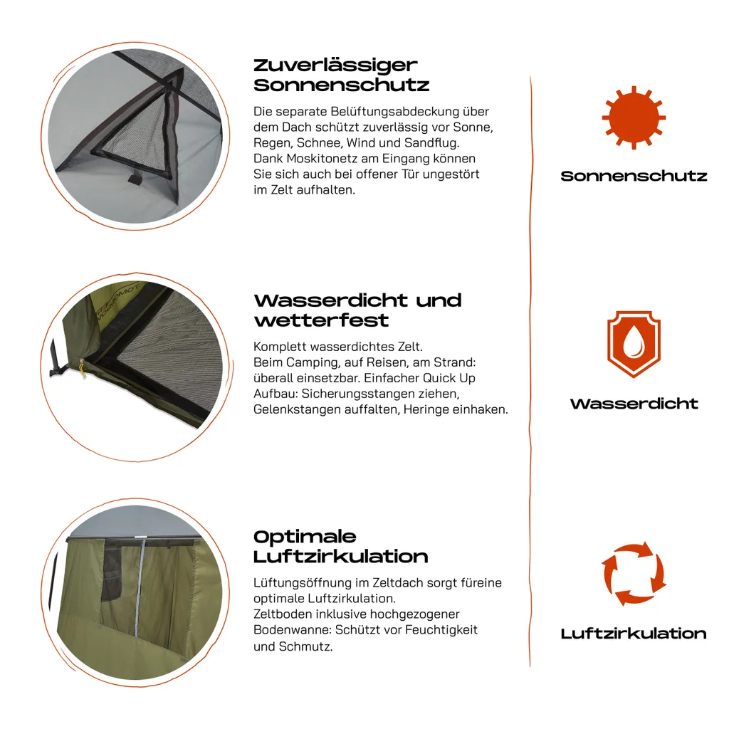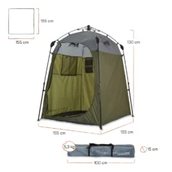 Die Stehhöhe und der abnehmbare Boden sind perfekt, um das Zelt als Dusch-, Umkleide-, oder Toilettenzelt nutzen zu können.