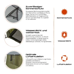Dabei sind Sie jederzeit vor schwierigem Wetter geschützt. Egal ob Regen, Wind oder Hitze – das Zelt ist wasserdicht und wetterfest.