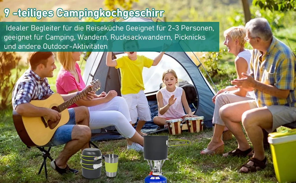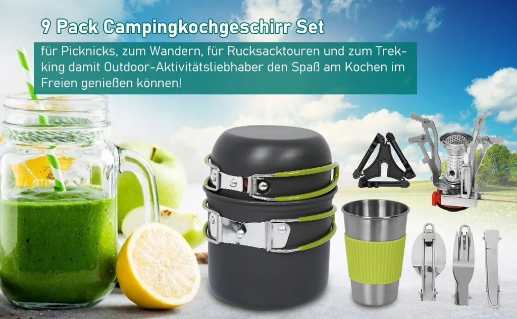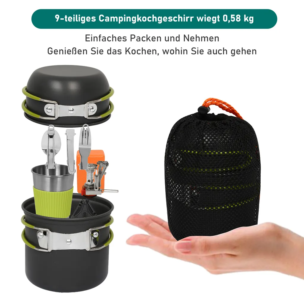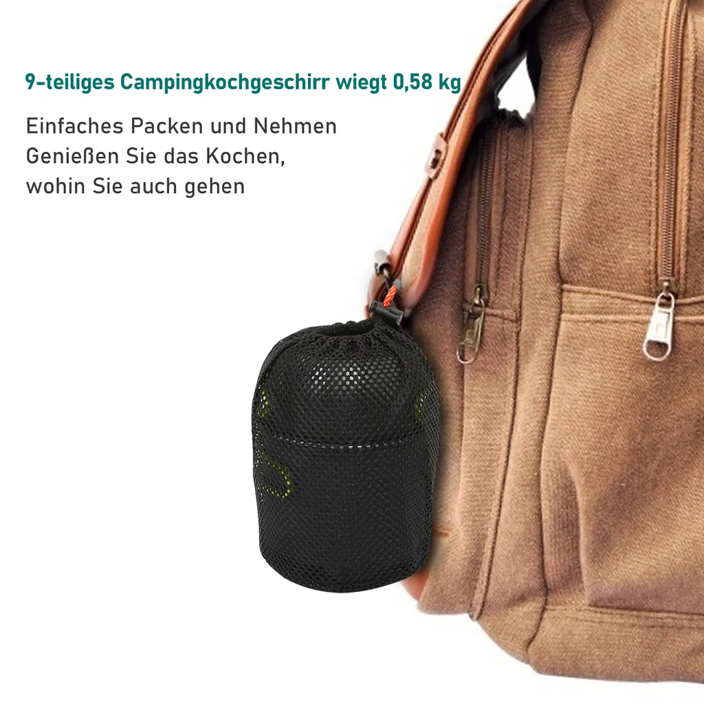 Camping-Kochgeschirr 9-teiliges Set, geeignet fuer alle, die Outdoor-Aktivitaeten moegen. Jedes Kochgeschirr enthaelt 1x Minikochgeschirr, 2x Antihaft-Aluminiumpfanne, 1x Edelstahlloeffel, 1x Edelstahlgabel, 1x Edelstahltischmesser, 1 Edelstahlbecher, 1 silikonisolierte