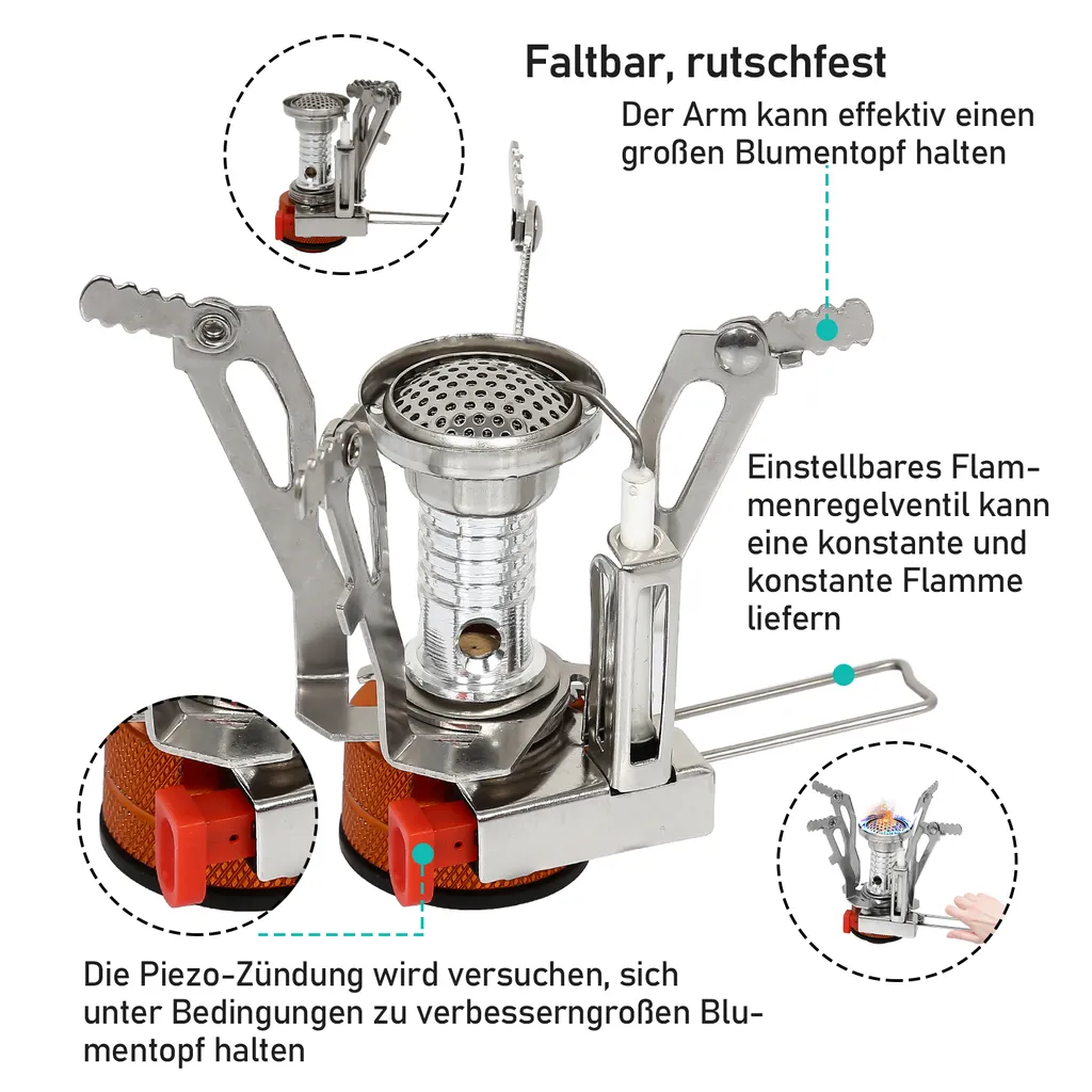 5. Ausgestattet mit 1x Gastankhalter, 1x Mini-Gasherd, geniessen Sie den Spass des Kochens im Freien jederzeit und ueberall