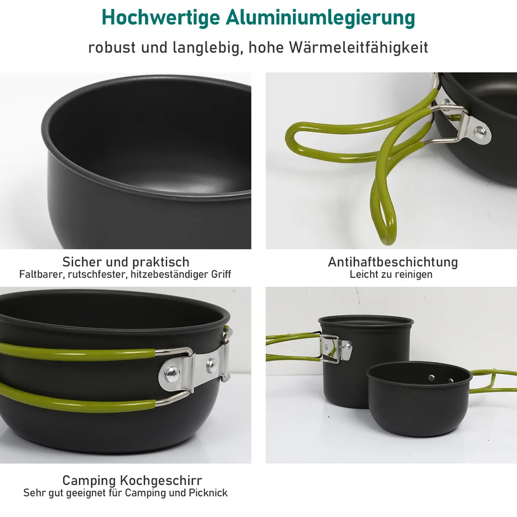 4. Campingkochgeschirr besteht aus hochwertiger Aluminiumlegierung und Edelstahl, ist verschleissfest, korrosionsbestaendig, leicht zu reinigen und aeusserst langlebig