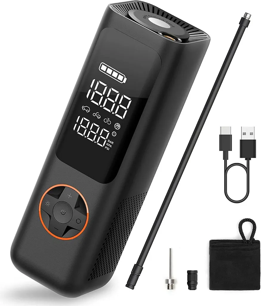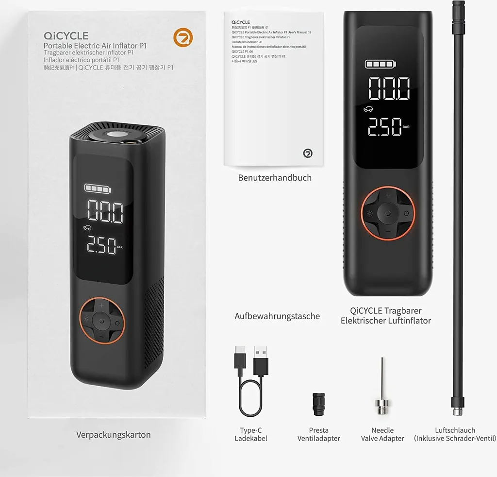 - ????【5 Voreingestellte Modus & Typ-C-Ladeanschluss】QiCYCLE Inflator hat ein hintergrundbeleuchtetes HD-LCD-Display und 5 voreingestellte Reifendruckmodus. Es wird automatisch stoppen, sobald der voreingestellte Reifendruckwert erreicht ist. Der Benutzer kann den Reifendruck in Echtzeit auf dem Display ablesen. Typ-C-Ladeanschluss macht es einfach aufgeladen werden