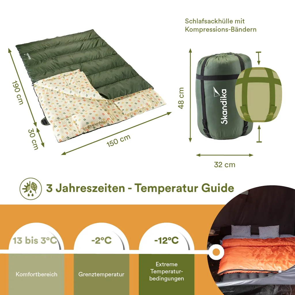 Nicht umsonst heißt dieser Schlafsack Iceland Double, denn in Island kann es in allen Jahreszeiten kalt werden.Die eingesetzten Materialen sind in dieser Hinsicht ausschlaggebend. Das wasserabweisende und atmungsaktive Polyester der äußeren Stoffschicht, ist eine Textilie, die Wärme mithin am besten isoliert. Kombiniert mit dem isolierenden Stoffsteg entlang des 2-Wege-Reißverschlusses und dem super weichen Innenfutter aus hautfreundlichem PolyBaumwolle, kann die Wärme einfach nicht mehr entweichen.Die verwobene 300 g/m² Mikrofaserfüllung ist es, die das Entstehen der Wärme im Inneren des Schlafsacks ermöglicht. Der Schlafsack Iceland Double ist durch diese Material-Features ein zuverlässiger 3-Saison-Begleiter, der auch visuell sehr reizvoll ist: außen ist er nämlich einfarbig dunkelgrün, während das hellere Innenfutter aus buntem PolyBaumwolle mit einem frischen Fantasie-Print versehen ist. Insgesamt ist das schöne Material nicht nur angenehm auf der Haut, sondern auch geräuschfrei. Das lästige Knirschen und Rascheln bei jeder Bewegung wurden hier komplett beseitigt.Unser Skandika Schlafsack Iceland Double wurde zwar als Doppelschlafsack konzipiert, er lässt sich allerdings, wie ein wahrer Verwandlungskünstler, ruckzuck zu zwei Einzelschlafsäcken umwandeln. Das geht ganz einfach, indem die Unter- und Oberseite voneinander getrennt, jeweils individuell zusammengeklappt und anschließend mit dem Reißverschluss wieder zugemacht werden. Aus eins wird so zwei gemacht, wobei natürlich nun der Schlafsack, der aus der ehemaligen Unterseite mit dem Kopfteil entsteht, etwas länger ist. Beim Campen oder generell beim Reisen können alle möglichen unvorhergesehenen Konstellationen eintreffen, weshalb es immer praktisch ist, ein solches Multitalent an Schlafsack bei sich zu haben.Zum Lieferumfang gehören zwei schöne Kissen dazu, die mit dem gleichen Stoff des Innenfutters überzogen sind, sowie ein Packsack mit Kompressionsbändern – so kann der Schlafsack zusammengerollt ganz easy transportiert werden.Erwähnenswert ist noch die kleine Aufbewahrungstasche mit Klettverschluss im Inneren des Schlafsacks. Alles Wichtige passt für die Nacht rein und nichts fällt raus. Super praktisch für Smartphone, Schlüssel, Wertgegenstände & Co.Last but not least ist die einfache Pflege zu betonen. Einfach den Schlafsack in der Waschmaschine bei 30 °C im Schonprogramm waschen.Außenmaterial: 170T Polyester, wasserabweisendFutter: PolyBaumwolleFüllung: 300 g/m² MikrofaserGröße als Doppelschlafsack (LxB): 220 (190+30) x 150 cmGröße als 2 Einzelschlafsäcke (LxB): 220 x 75 cm und 190 x 75 cmTrennbar2 Kissen inklusive2-Wege-ReißverschlussReißverschlussabdeckung mit KlettReißverschluss mit WärmeisolierungInnentasche mit KlettKompressionspacksack3-Saison (Komfortbereich 13 – 3 °C)Gewicht: 3.300 gPackmaß: 48 x 32 x 32 cm