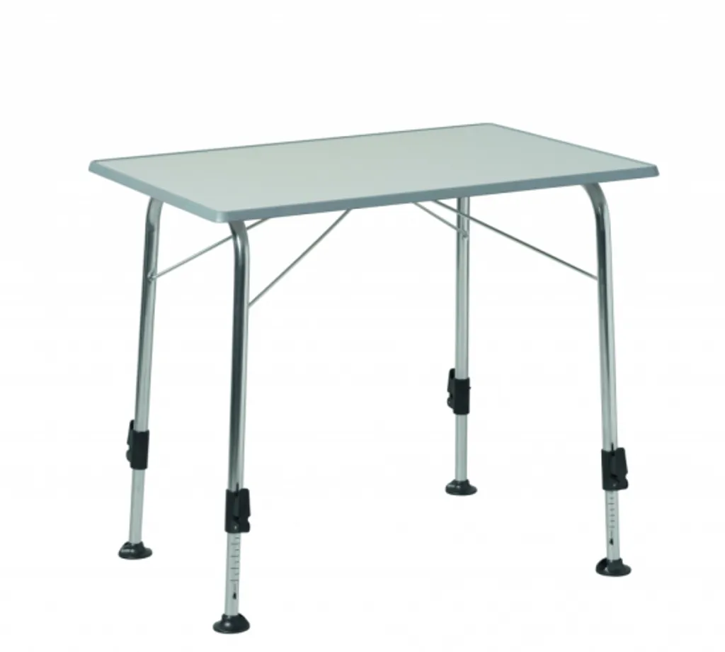 Halbautomatisch einzeln verstellbare Tischbeine mit beweglichen Tischfußauflagen, die sich am Untergrund ausrichten und verbesserte Höhenverstellung. Maße 80 x 60 x Höhe 57/74 cm.Packmaß ca. 80 x 60 x 5 cm. Gewicht ca. 6 kg. Tischplatte Grau.