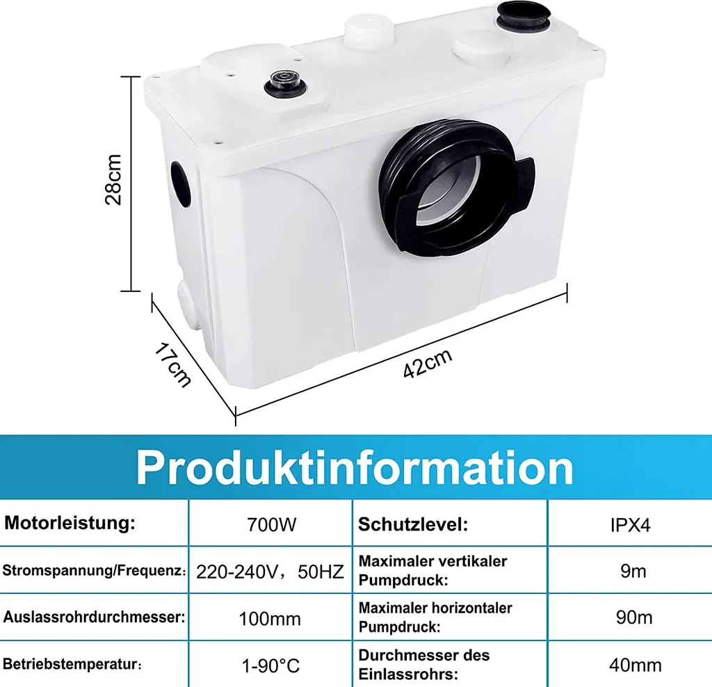 Schmutzwasserpumpe – Leistung: 700W, Förderleistung: Maximal 180L/min, Material: Kunststoff+Edelstahl, Spannung / Frequenz: 220-240 V, 50 Hz, Abmessungen(LxBxH): 42x28x17cm, Farben: Weiß. 4 in 1 Abwasserbehandlungssystem – Es gibt vier Wassereinlässe