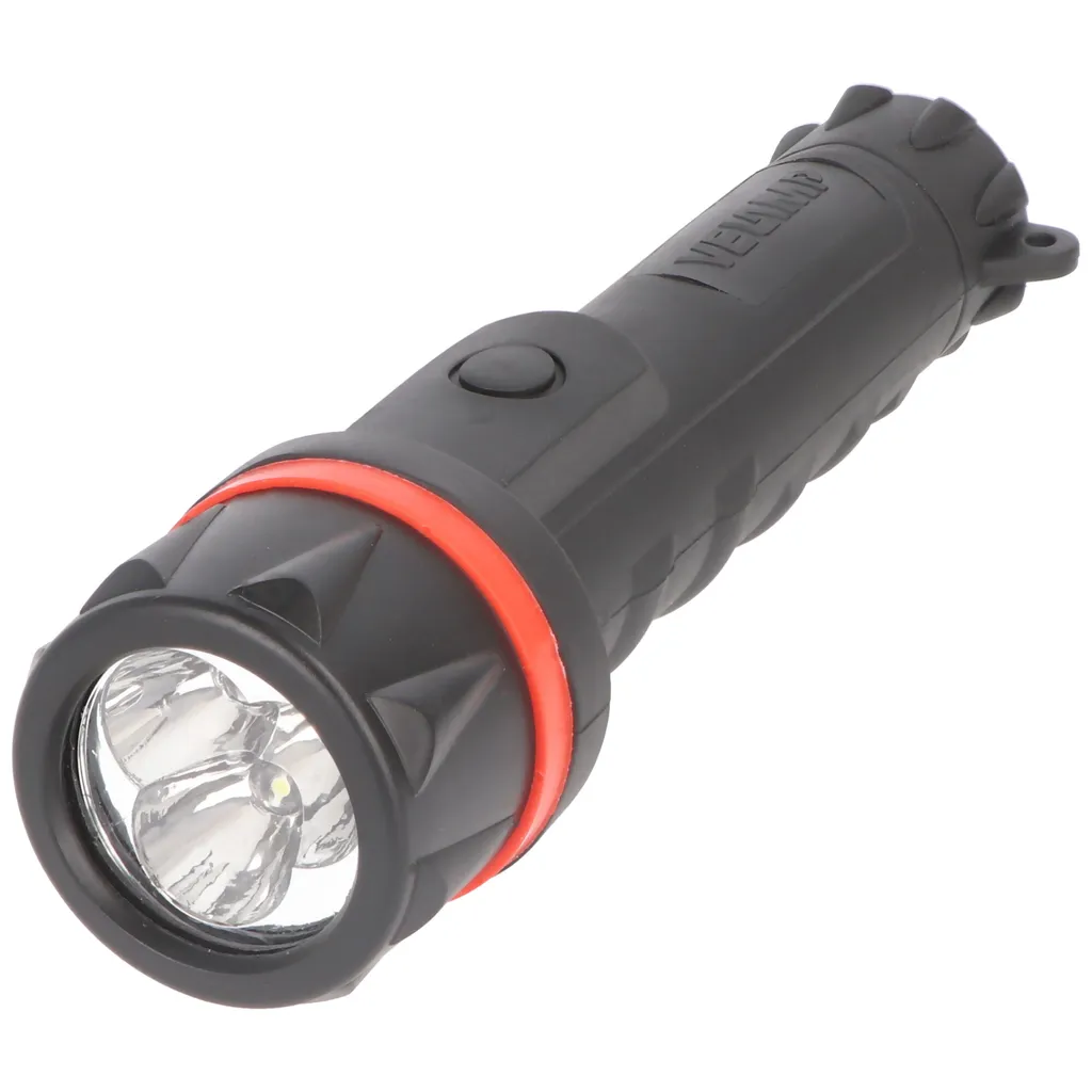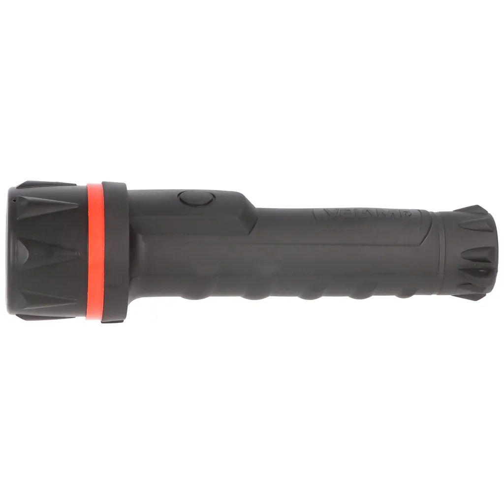 Velamp LED Gummi-Taschenlampe, 3 LEDs, wasserdicht, mit Tragesenkel, Lieferung ohne Batterien kurz und kompakt, unser Artikel stellt sich vor✓ kompakte LED-Taschenlampe aus hochbeständigem Gummi✓ wird mit 2x AA Mignon Battterien betrieben, nicht im Lieferumfang enthalten✓ super hell mit 12 Lumen und einer Reichweite bis zu 20 Metern✓ außergewöhnliche Autonomie von 30 Stunden im Dauereinsatz✓ Gummikörper: leicht, schlagfest und wasserdichtLED-Taschenlampe aus hochbeständigem Gummi mit einer Helligkeit bis zu 12 Lumen und einer Reichweite bis zu 20 Metern. Die Taschenlampe ist mit 3 LEDs der neuesten Generation ausgestattet. Die Vorteile von Gummi sind vielzählig – leicht, schlagfest und wasserdicht. Dank der kompakten Größe können Sie die Taschenlampe überall mitnehmen, egal ob im Auto, Wohnmobil, Tasche, Rucksack oder Werkzeugkasten. Ebenfalls praktisch ist der integrierte Tragesenkel, welcher die Handhabung noch bequemer gestaltet. Dank dem Gummikörper liegt die LED Leuchte bequem und sicher in der Hand. Eine Taschenlampe für jeden Zweck – die Velampe IRUB1LED Taschenlampe. Gummi-Taschenlampe perfekt für die Baustelle, Werkstattarbeiten, Ausflüge, Angeln, Camping, Autos etc. ! Im Lieferumfang befindet sich eine IRUB1LED Taschenlampe. Technische Daten Lichtquelle: Standard LED Watt: 0,2 Lumen: 12 Lichtstrahl: Fokus Reichweite: 20 m Abmessungen: 150mm x 42mm x 42mm Gewicht: 80 g