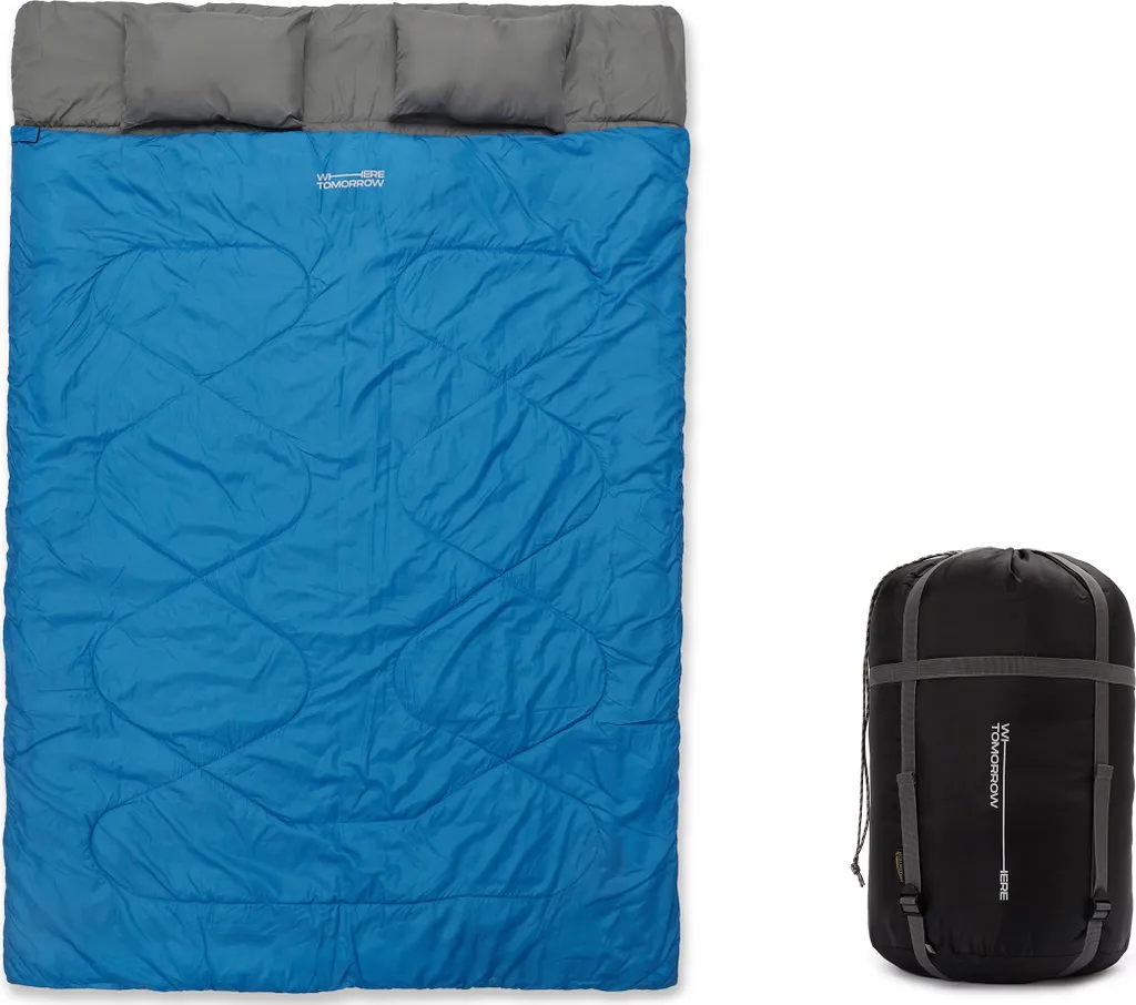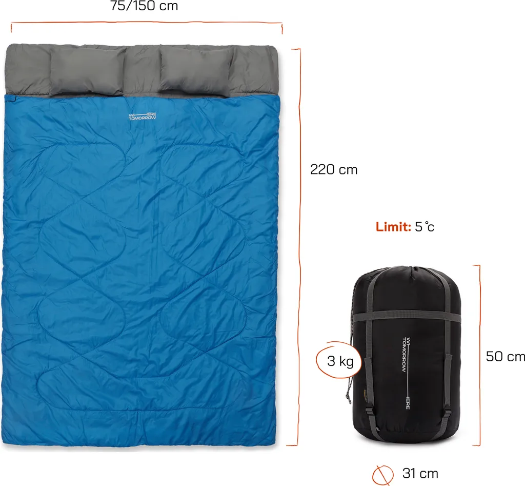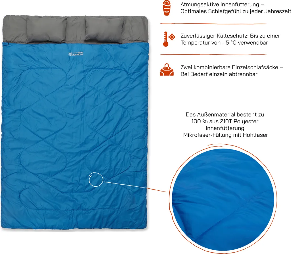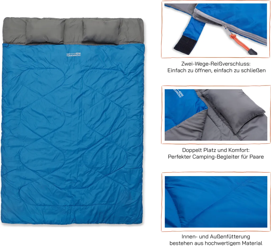 Komfortabler Doppel-Schlafsack von Where Tomorrow – Extra viel Platz beim Camping Der komfortable Doppel-Schlafsack von Where Tomorrow ist der perfekte Camping-Begleiter für Paare, Familien mit einem kleinen Kind und Einzelpersonen. Auf Reisen oder im Urlaub. Der aus zwei Einzelschlafsäcken bestehende 2-Personen Schlafsack ist mit einem 2-Wege-Reißverschluss und zwei eingearbeiteten bequemen Kopfkissen ausgestattet. Er besitzt eine Länge von ca. 190 cm und eine Breite von ca. 150 cm. Gewicht – 3 Kg. Aus zwei mach eins! Der Doppelschlafsack besteht aus zwei aneinander gesteckten Einzelschlafsäcken (ideal für Paare), die sich bei Bedarf auch ganz problemlos voneinander trennen lassen. Je nach Bedarf haben Sie so einen großen Doppelschlafsack oder zwei einzelne Schlafsäcke. Ruhiger Schlaf durch Wärmeisolierung Durch die Schlafsackform, welche nach unten hin zuläuft, bleibt wenig unausgefüllter Raum im Schlafsack, der vom Körper beheizt werden muss. Die Körperwärme geht daher nicht verloren und nimmt auch in den kälteren Stunden kaum ab. Extra Fach fürs Kopfkissen An der Kopfteilrückseite des Schlafsacks ist ein separates Fach angebracht, in das ein Kopfkissen problemlos hineinpasst. Angenehme Wärme für alle vier Jahreszeiten Die Kunstfaserfüllung hat den Vorteil, dass sie auch bei hoher Luftfeuchtigkeit nicht verklumpt. Der Schlafsack bietet eine angenehme Wärme für alle vier Jahreszeiten und ist für eine Mindesttemperatur von bis zu -5° C geeignet. Reißverschluss mit Einklemmschutz Da die meiste Körperwärme über den Kopf verloren geht, kann die Kontur-Kapuze vom Schlafsack per Kordel verkleinert werden. Der verwendete Zweiwege-Reißverschluss erleichtert den Ein- und Ausstieg, besitzt einen Einklemmschutz, so dass sich der Reißverschluss nicht im Futter verhakt und reguliert zeitgleich auch die Zufuhr von kühlerer Luft.